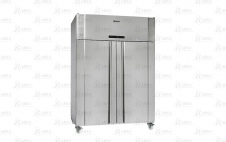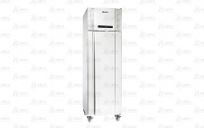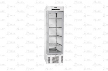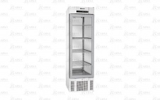 Узкий морозильный шкаф со стеклянной дверью, белолакированными внешними панелями, внутренней нижней панелью из нержавеющей стали, внутренними боковинами из алюминия, 4 решетчатыми полками с пластиковым покрытием.