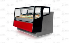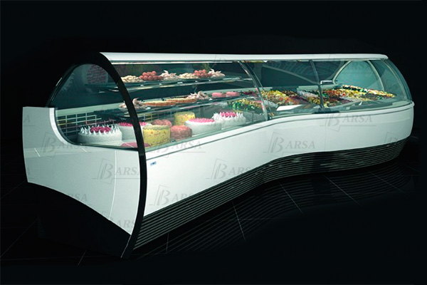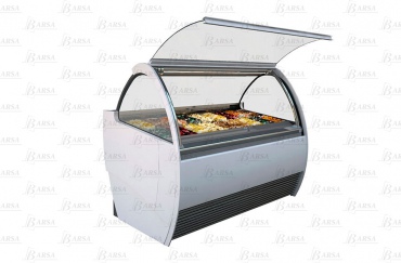 Стеклянная надстройка монтируется на боковых профилях из алюминия, анодированного серебром, несущих полку с плафоном подсветки из того же материала (две неоновые лампы). Переднее и боковые стекла – закаленные, с защитой от запотевания. Гнутое переднее стекло поднимается вверх на гидравлических поршнях. Со стороны продавца закрывается прозрачной крышкой из метакрилата.