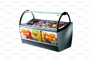 Профессиональная витрина для мороженого. Тщательно выверенные размеры и наклонное расположение выкладки позволяют рассмотреть продукцию не только взрослым, но и детям. Корпус – цельный, с наполнением из пенополиуретана, вспененного углекислотой, без использования озоноразрушающих веществ. Дно зоны выкладки и рабочая поверхность изготовлены из полированной нержавеющей стали, задняя панель – из пластифицированной стали, внешняя база – из крашеной стали. Декоративные боковые панели конструкции «сэндвич». Витрина снабжена регулируемыми ножками (стандарт) или поворотными колесиками для легкого перемещения (опция).