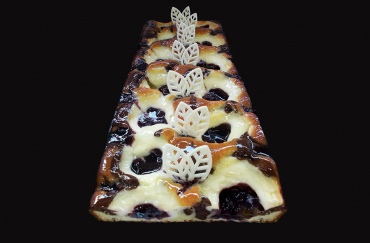 Пирожное "Домашнее" мраморное - подготовленное тесто полуфабриката "Мелла с каби" делят на две части (в одну часть добавляют пасту-какао "Каокрем"). Затем поочередно выкладывают в формы, сверху наносят начинку термостабильную "Черная смородина", полуфабрикат "Сметанный" и выпекают до готовности. После выпечки и остывания поверхность покрывают желе "Кларо" и оформляют ванильной глазурью МГ "Ваниль".