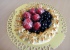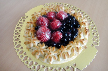 Пирожное "Фруктово-марципановое" - на пласт полуфабриката "Радуньский песочный" через кондитерский мешок отсаживают полуфабрикат "Выпечной марципановый" в виде бордюра и выпекают до готовности. После выпечки и остывания поверхность покрывают растопленной какао-глазурью жировой "Негро", оформляют ягодами предварительно смешанными с загустителем соков и начинок "Каби", художественно выкладывают фрукты и покрывают желе "Кларо".
