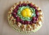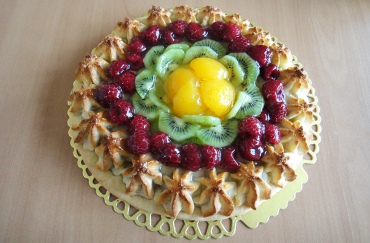 Пирожное "Фруктово-персипановое" - На пласт полуфабриката "Радуньский песочный" через кондитерский мешок отсаживают полуфабрикат "Выпечной персипановый" в виде бордюра и выпекают до готовности. После выпечки и остывания поверхность покрывают растопленной ванильной глазурью МГ "Ваниль", оформляют фруктами и покрывают желе "Кларо".