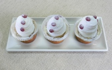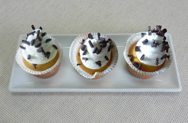 Пирожное "Капкейк банановый" - выпеченный полуфабрикат "Кекс микс" художественно оформляют взбитым кремом на растительных маслах "Кондита" с добавлением начинки "Софт-крем со вкусом банана" и посыпают декором шоколадным "Блоссомс темный".