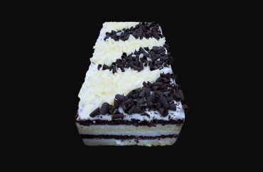 Пирожное "Каракум" - слои полуфабриката "Мелла сметанный" и полуфабриката "Захер" поочередно пропитывают сиропом и прослаивают желе "Сметанным". Поверхность оформляют декорами "Блоссомс белый" и "Блоссомс темный".