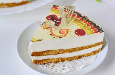 Пирожное "Кармен" - слои бисквита "Легкий" шоколадный пропитаны сиропом, прослоены кремом "Неженка". Поверхность оформлена этим же кремом, желе-глазурями, маком. Художественно украшена ванильной глазурью МГ "Ваниль".