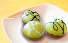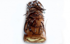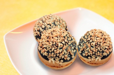 Пирожное "Снежок с орехом" - два штучных полуфабриката "Радуньский песочный" соединяют молоком сгущенным уваренным. Поверхность покрывают какао-глазурью жировой МГ "Чипс" и посыпают орехами.
