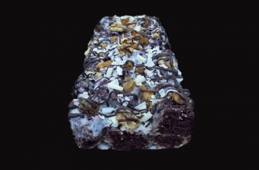 Пирожное "Соблазн" - пласт полуфабриката "Радуньский песочный" покрывают начинкой термостабильной "Черная смородина". Затем выкладывают полуфабрикат "Захер", измельченный на кусочки и смешанный с желе "Сметанным". Поверхность оформляют грецкими орехами, изюмом, декором шоколадным "Белоссомс белый" и какао-глазурью жировой МГ "Чипс".