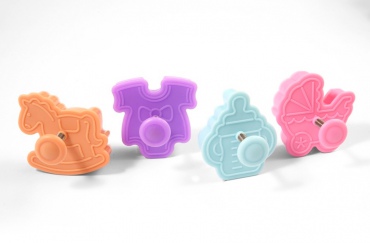 Набор из 4 полипропиленовых выемок "Лошадка, соска, коляска, нагрудник" поможет создать оригинальные десерты. Продуманная конструкция вырубок обеспечивает удобство, безопасность и долговечность использования. Набор выемок подходит для работы с тестом и мастикой.