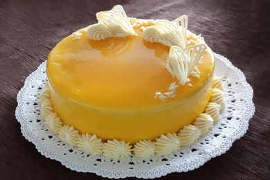 - торт "Манго с белым шоколадом" - сочетание нежного песочного теста, сочного бисквита и крема на основе белого шоколада с добавлением аромапасты;