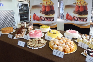 * торты, приготовленные с использованием новой смеси для производства насыщенного шоколадного бисквита - "Шоколадно-лимонный" (с лимонным кремом на смеси для стабилизации "АЕ Лимон"), "Иллюзия обмана" (с белым шоколадом и творожным кремом - смесь «Виста крем творожно-йогуртовый»), "Венская мелодия" и "Страчателла" с заварным кремом (смесь для крема "Стандарт").
