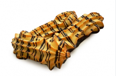 Сладость мучная "Мадлен" с глазурью - подготовленное тесто полуфабриката песочного "Нежный" через кондитерский мешок отсаживают листы, застланные пергаментной бумагой и выпекают до готовности. После выпечки и остывания оформляют какао-глазурью жировой МГ "Чипс".