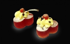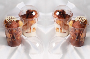 Топ-десерт "Пломбир" - штучный выпеченный полуфабрикат "Палома-микс" №2 соединяют полуфабрикатом отделочным "Сабрина-какао". Поверхность оформляют полуфабрикатом отделочным "Сабрина-какао", декором шоколадным "Специальный" и посыпают декоративной пудрой "Вестфалия Супершни".