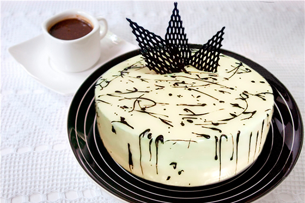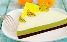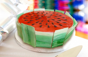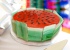 Торт "Арбузный бриз" - слои бисквита "Легкий" пропитывают сиропом и прослаивают полуфабрикатом отделочным "Сабрина-арбуз". Верхнюю поверхность покрывают желе-глазурью "Кристалин" с добавлением красителя и художественно оформляют какао-глазурью жировой МГ "Чипс". Боковые стороны оформляют ванильной глазурью МГ "Ваниль" с добавлением красителя.