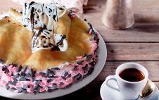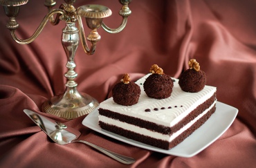 Торт "Бланджини" - слои полуфабриката бисквитного "Браунис" прослаивают полуфабрикатом отделочным "Сабрина-ваниль". Поверхность и боковые стороны глазируют полуфабрикатом отделочным "Сабрина-ваниль". Верхнюю поверхность художественно оформляют какао-глазурью жировой МГ "Чипс и орехом". Боковые стороны обсыпают крошкой полуфабриката бисквитного "Браунис".