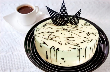 Торт "Фантазия" - слои полуфабриката "Мелла сметанный" соединены кремом "Основной", смешанным с начинкой "Молочно-масляная" и ароматизатором "Ром Европа". Поверхность и боковые стороны покрыты полуфабрикатом отделочным "Шокобелла" (Шокобелла белый шоколад) и художественно оформлены какао-глазурью жировой МГ "Чипс". Верхняя поверхность украшена шоколадным декором "Сетка".
