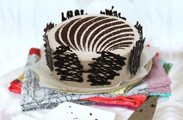 Торт "Гризаль" - слои бисквита "Нежный шоколадный" пропитаны сиропом №96 и прослоены кремом "Стандарт". Верхняя поверхность посыпана декоративной пудрой "Вестфалия супершни", на которую через трафарет наносится рисунок из кофе. Боковые поверхности фигурно украшены какао-глазурью жировой МГ "Чипс".