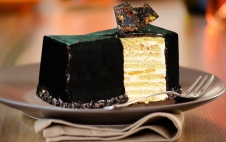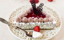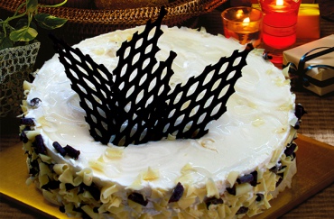 Торт "Йогуртный" - слои бисквита "Легкий" пропитывают сиропом и прослаивают кремом "Основной" с добавлением смеси для мороженого и десертов "Йогурт 50". Верхнюю поверхность покрывают желе-глазурью "Кристалин" и оформляют декором шоколадным "Сетка". Боковые стороны обсыпают декорами шоколадными "Блоссомс белый" и "Блоссомс темный".