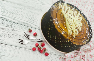 Торт "Карамелька" - слои бисквита "Нежный шоколадный" поочередно прослоены кремом "Фрио-Люкс" и кремом "Фрио-Люкс", смешанным с десертной пастой ДП "Карамель". Верхняя поверхность покрыта кремом "Фрио-Люкс", заглазирована желе-глазурью "Кристалин" и художественно украшена десертной пастой ДП "Карамель". Верхняя и боковые поверхности художественно украшены какао-глазурью жировой МГ "Чипс" и ванильной глазурью МГ "Ваниль".