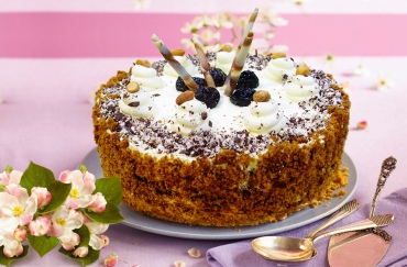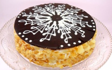 Торт "Медок" - слои п/ф "Мелла-мед" прослоены уваренным сгущенным молоком, черносливом и дробленым орехом. Поверхность покрыта кремом "Неженка". Боковые стороны и половина поверхности обсыпана крошкой п/ф "Мелла-мед". Верх оформлен этим же кремом, черносливом и глазурями.