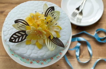 Торт "Праздник" - слои бисквита «Легкий» пропитаны сиропом, поочередно прослоены начинкой «Молочно-масляная», кремом «Основной», черносливом и орехом. Поверхность и боковые стороны покрыты начинкой «Молочно-масляная» и мастикой сахарной «Бьянка фондант». Верх изделия художественно украшен мастикой сахарной «Smart Sugar» и шоколадный декором «Специальный».