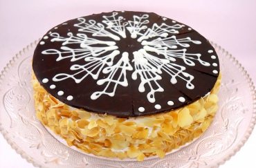 Торт "Шоколадно-миндальный" - слои полуфабриката "Браунис-микс" пропитаны сиропом и прослоены кремом "Кондита-као". Верхняя поверхность оформлена струганным миндалем "Альмонд", декоративной пудрой "Вестфалия Супершни", какао-порошком и какао-глазурью жировой МГ "Чипс". Боковые стороны обсыпаны дробленым орехом.