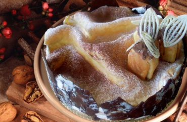 Торт "Вечер в Сорренто" - два пласта полуфабриката "Палома-микс" №2 соединены кремом "Основной" и штучным полуфабрикатом "Палома-микс" №2, предварительно заполненным начинкой "Молочно-шоколадная". Верхняя поверхность оформлена штучным полуфабрикатом "Палома-микс" №2, предварительно заполненным начинкой "Молочно-шоколадная", шоколадным декором "Специальный", посыпана какао-порошком и декоративной пудрой "Вестфалия Супершни". Боковые стороны отделаны кремом "Основной", художественно украшены ванильной глазурью МГ "Ваниль" и какао-глазурью жировой МГ "Чипс".