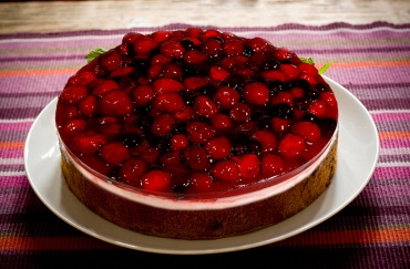 Торт "Ягодный десерт" - слой полуфабриката "Мелла" пропитан сиропом и заглазирован желе "Кларо", смешанным с начинкой "Десертная". Верхняя поверхность оформлена ягодами с добавлением загустителя соков и начинок "Каби", по краям в виде бордюра отсажен полуфабрикат отделочный "Шоколадный". боковые стороны обсыпаны тертой ванильной глазурью.
